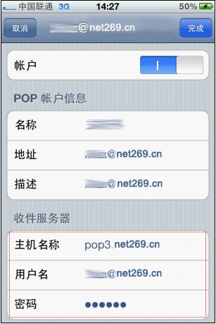 四、收件服務器中設置您的郵件服務器,賬號和密碼,郵件服務器您可以填寫“pop3.net269.cn”(也可以填寫pop3.您的域名,視您是否做得高級解析決定的):