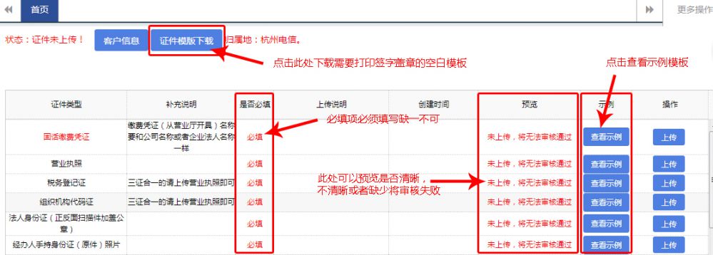 第一步 :登陸平臺 地址:tx.k400.cc 第二步:輸入您的400號碼,輸入你的密碼 登陸完成之后,為保障您企業(yè)信息安全,建議修改密碼。 第三步:按照平臺提示部分進行操作,先在下載證件模版,進行解壓 按照里面的復機要求文件準備相關的資質文件,如果不清楚具體的規(guī)范,可參照后面的查看示例進行比對。平臺上有具體的標識。
